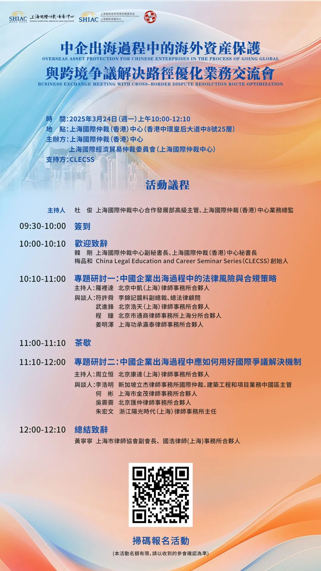 由上海國際仲裁(香港)中心、上海國際仲裁中心主辦,China Legal Education and Career Seminar Series(CLECSS)作為支持機構的“中企出海過程中的海外資產保護與跨境爭議解決路徑優化業務交流會”將於2025年3月24日(週一)上午在上海國際仲裁(香港)中心舉辦。註冊链接詳見活動海報二維碼。