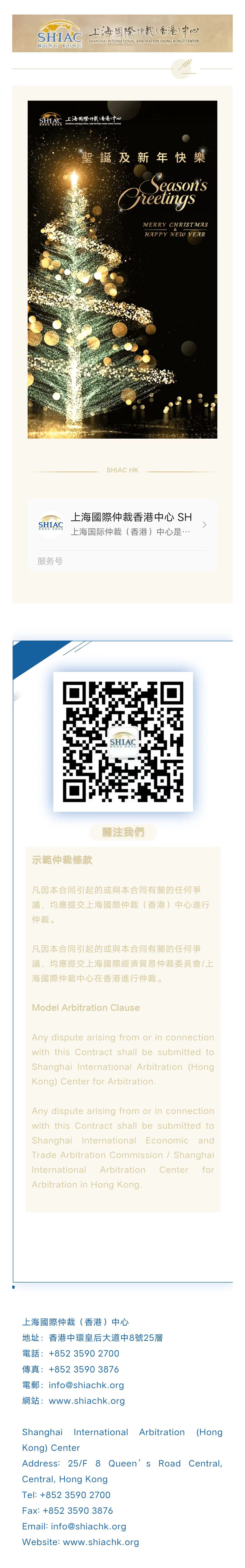 上海国际仲裁(香港)中心祝愿大家圣诞及新年快乐 发布时间:2025-12-30 上一篇:上海国际仲裁(香港)中心恭祝新春快乐 下一篇:SHIAC HK&SHIAC新闻 |「全球资产发展战略解密:离岸架构设立、公司治理与跨境争议解决」研讨会成功举办 返回列表 >