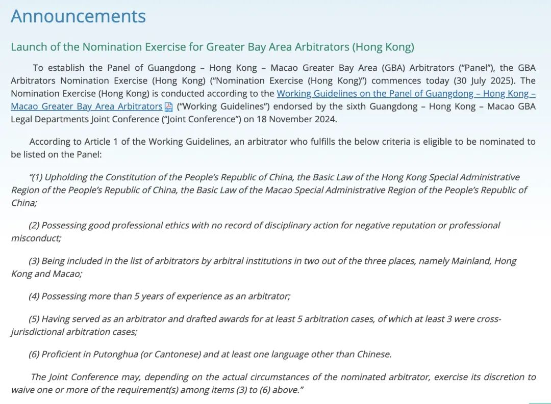 On 30 July 2025, to establish the Panel of Guangdong – Hong Kong – Macao Greater Bay Area (GBA) Arbitrators (“Panel”), the Department of Justice of the Hong Kong Special Administrative Region Government (“HK DoJ”) issued a public announcement launching the GBA Arbitrators Nomination Exercise (Hong Kong) (“Nomination Exercise (Hong Kong)”), according to the Working Guidelines on the Panel of GBA Arbitrators (“Working Guidelines”) adopted by the sixth Guangdong – Hong Kong – Macao GBA Legal Departments Joint Conference held on 18 November 2024.