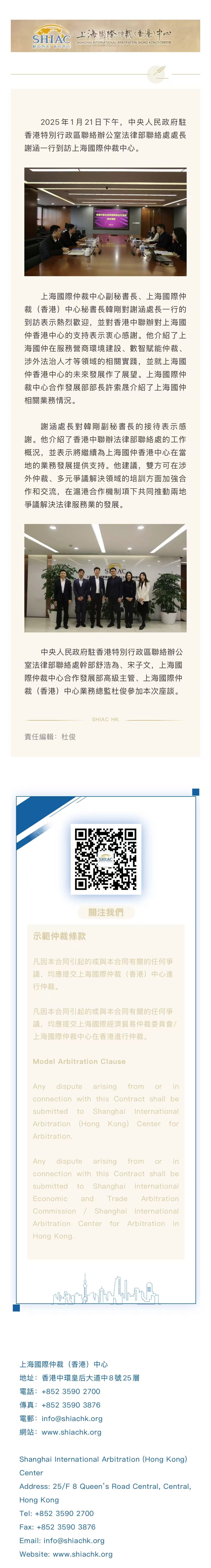 中央人民政府駐香港特別行政區聯絡辦公室法律部聯絡處代表團到訪上海國際仲裁中心 發布時間:2025-01-21 上一篇:香港仲裁近期發展介紹 下一篇:上海國際仲裁(香港)中心恭祝大家新春快樂 返回列表 >