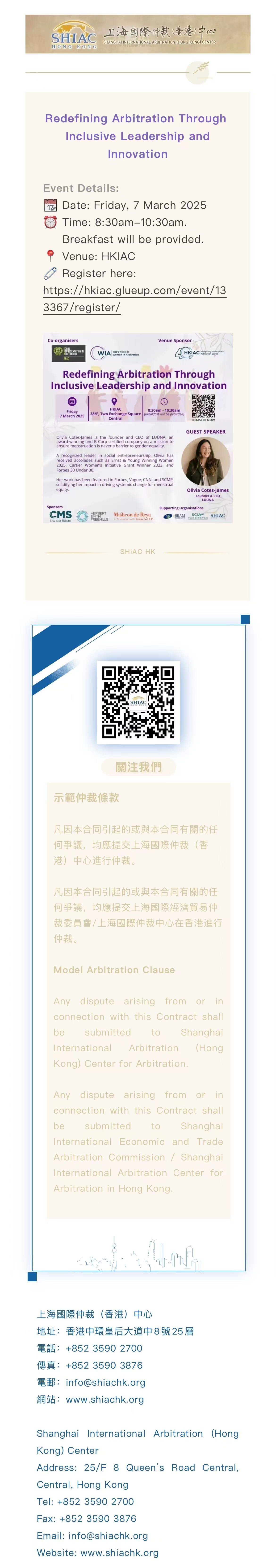 SHIAC HK Supporting Event|WIA & ERA APAC 發布時間:2025-03-08 上一篇:SHIAC HK & SHIAC 支持活動|Women in Arbitration 2025 下一篇:无 返回列表 >